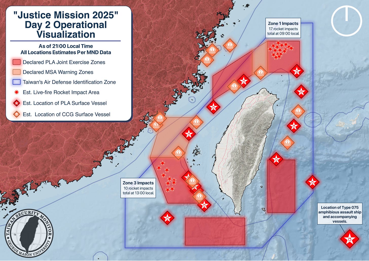 Justice Mission 2025 (December 2025): Representing the largest drills by coverage to date, this exercise utilized seven encirclement zones and focused on sealing off ports and energy corridors. It was notable for showcasing advanced technology like humanoid robots and micro-drones while mobilizing civilian shipping, all while continuing the established motif of punitive blockade and integrated coast-guard presence.