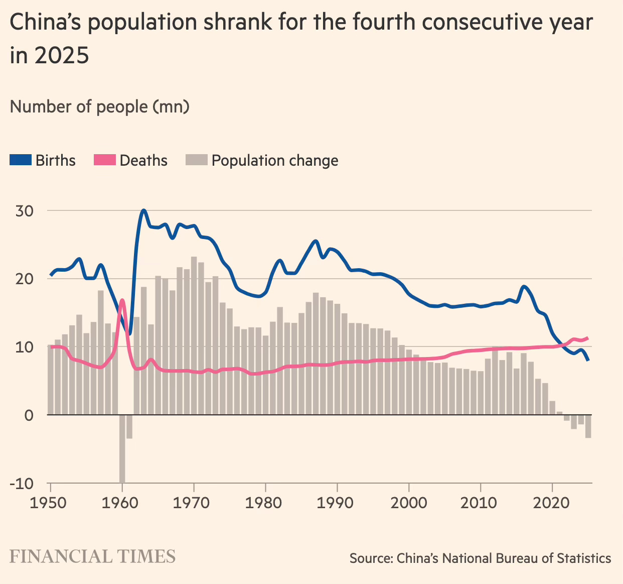 China’s population fell for a fourth consecutive year in 2025, with births dropping to a record low of 7.92 million — down 17% from 2024 — according to official data. The total population shrank by 3.39 million to 1.405 billion, while deaths rose to their highest level since 1968, highlighting the scale of the country’s demographic crisis.