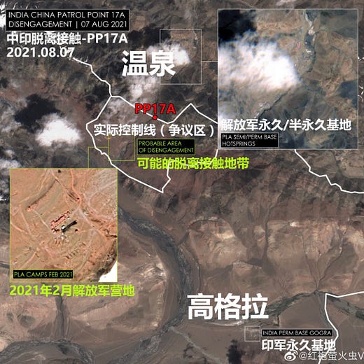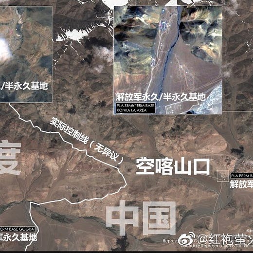 I came across two maps annotated by a Chinese blogger. The maps were original made by the OSINT Twitter account @detresfa_. The first image shows the area around PP17A and which are annotated in Chinese by the blogger. But the images shared on Weibo also have a line that shows us the Chinese perception of the LAC.
